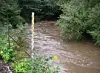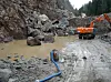 The stream continues to swell and triggers a landslide in a newly dug slope. The ooze runs into the nearby river and into a protected lake further down in the valley where salmon are spawning. The sediments continue to flow in for hours if nothing is done.